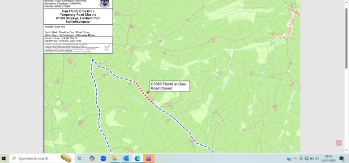 Hewl ar gau Dihewyd Road Closure 24/11/25